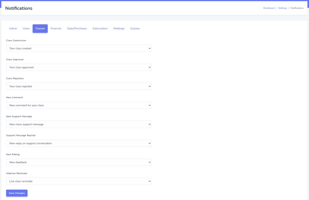 To assign a notification template to a process, navigate to the “Admin panel/ Settings/ Notifications” and select a template for each process.