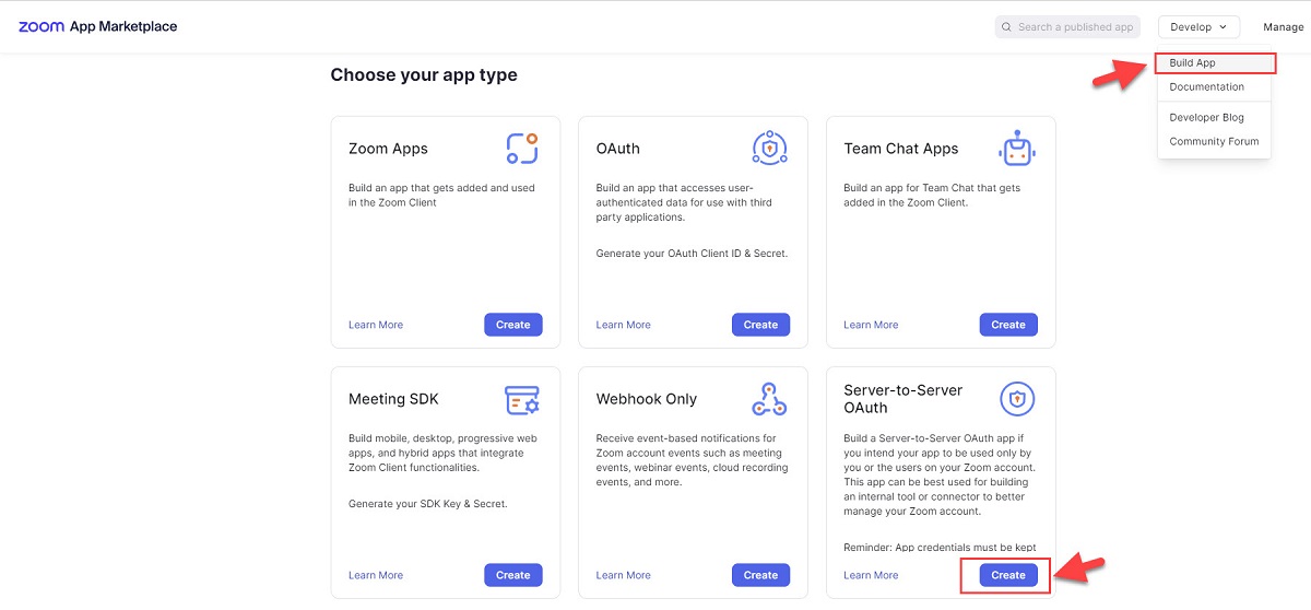 - Click on Develop -> Build app after signing in to Zoom marketplace and after that click on “create” under Server-to-Server OAuth.