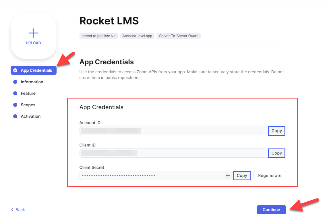 - After you fill in the name above, you will be redirected to the App credentials section, here copy the Client ID,Client Secret and Account ID using the copy link and paste these values inside the instructor Zoom settings page.