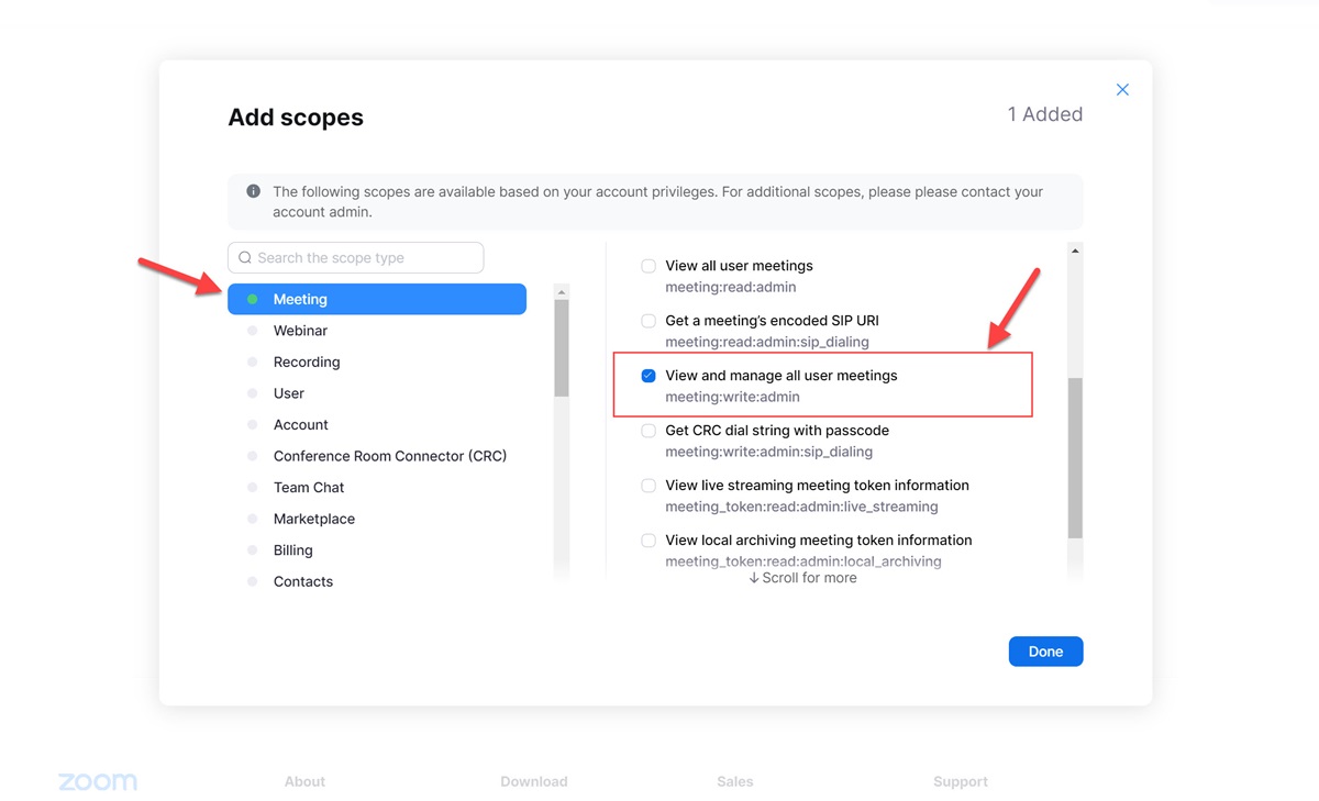 - In the Scopes step,You should Enable the "meeting:write:admin" scope.